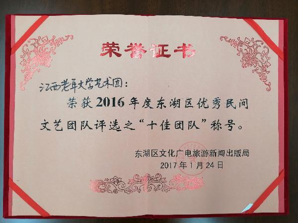 2017年校金年会手机版app下载荣获东湖区优秀民间文艺团队”十佳团队“称号
