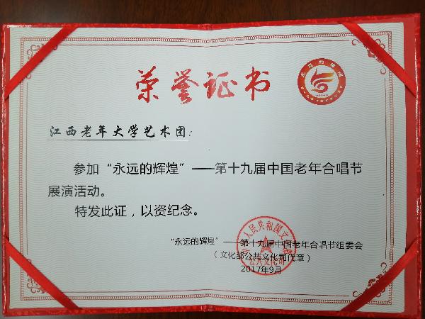 2017年9月校合唱团代表江西省参加了文化部主办的”永远的辉煌第十九届中国老年合唱节展演