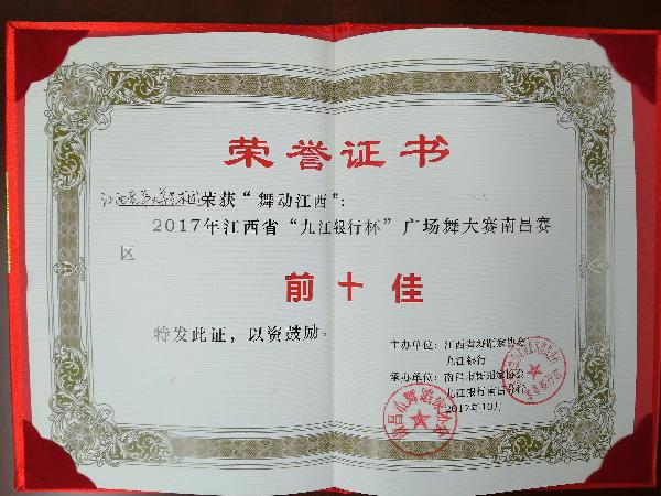 2017年10月校舞蹈队获江西省”九江银行杯“广场舞大赛前十佳