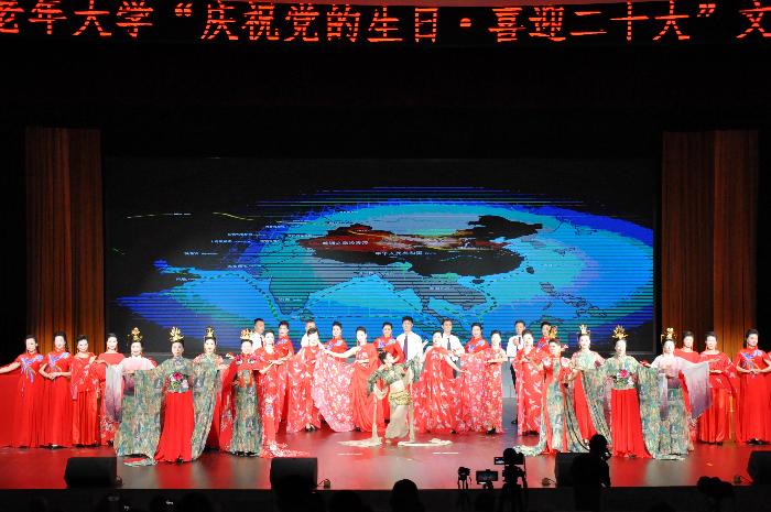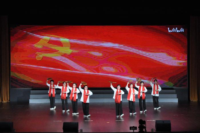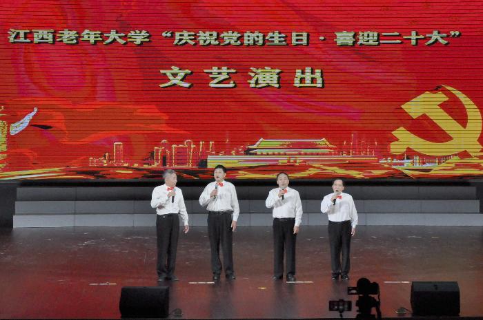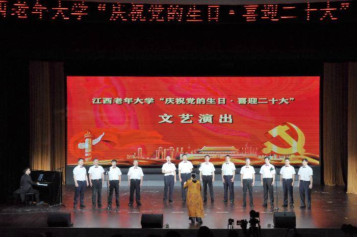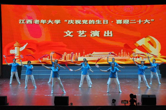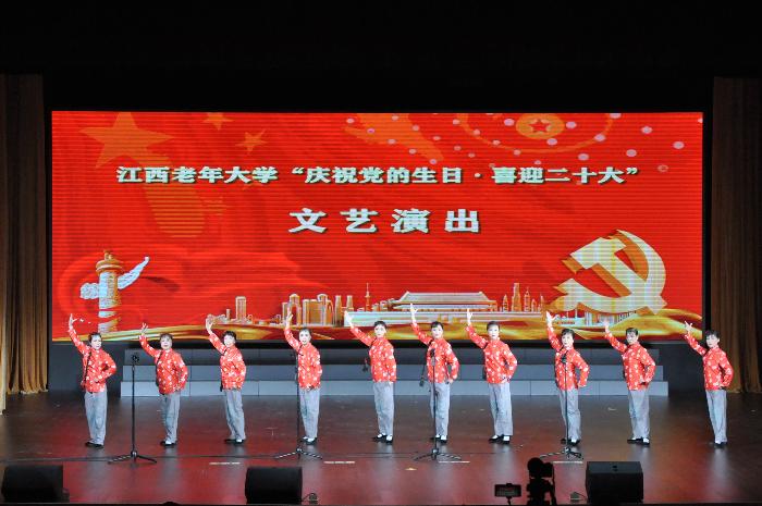 文艺演出在大合唱《我们共产党人好比种子》歌声中拉开帷幕,舞蹈《东方红》,男声小组唱《永远跟党走》,健身表演《我和我的祖国》,时装《丝路畅想》等16个精心编排的节目先后精彩呈现,赢得现场观众阵阵掌声。整场演出运用丰富的艺术手法和舞台表现力,生动展现了老年学员们健康快乐、积极向上的精神状态,抒发了老年学员们对伟大的党、伟大的祖国无限热爱和对美好生活的无尽赞美。表达了老年学员们坚定信念,听党话、感党恩、跟党走,在习近平新时代中国特色社会主义思想指引下,传承红色基因,牢记初心使命,以实际行动喜迎党的二十大胜利召开的豪迈情怀。