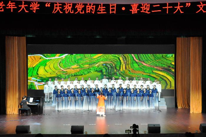 文艺演出在大合唱《我们共产党人好比种子》歌声中拉开帷幕,舞蹈《东方红》,男声小组唱《永远跟党走》,健身表演《我和我的祖国》,时装《丝路畅想》等16个精心编排的节目先后精彩呈现,赢得现场观众阵阵掌声。整场演出运用丰富的艺术手法和舞台表现力,生动展现了老年学员们健康快乐、积极向上的精神状态,抒发了老年学员们对伟大的党、伟大的祖国无限热爱和对美好生活的无尽赞美。表达了老年学员们坚定信念,听党话、感党恩、跟党走,在习近平新时代中国特色社会主义思想指引下,传承红色基因,牢记初心使命,以实际行动喜迎党的二十大胜利召开的豪迈情怀。