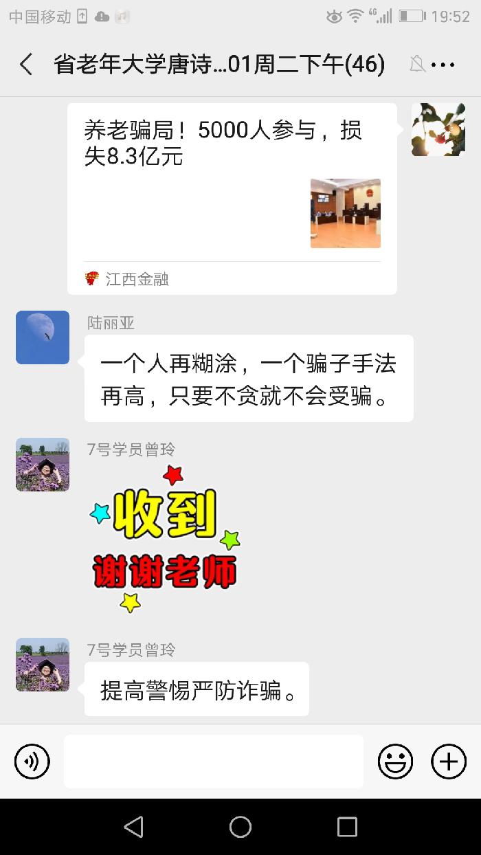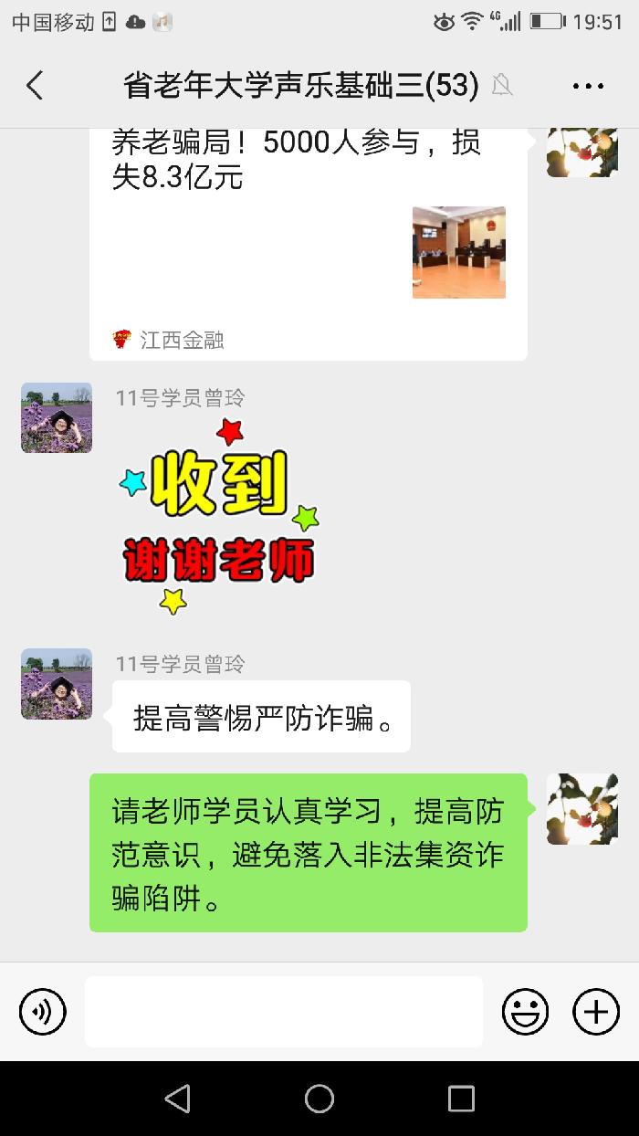 为进一步营造清朗无诈的校园氛围,切实提高老年学员识骗防骗能力。根据省委老干部局和省防范和处置非法集资工作领导小组关于做好防范非法集资宣传进校园通知要求,金年会手机版app下载第一时间布置并落实,迅速在全校123个教学班级,5000余名师生学员中开展防范非法集资诈骗专项宣传,做到每个班级、每位老年学员对识诈防诈意识入心入脑,切实守护自身财产安全,助力社会和谐稳定。截至8月1日活动当天,全校共有4600余人次参与网络互动,老年学员反响热烈好评如潮。